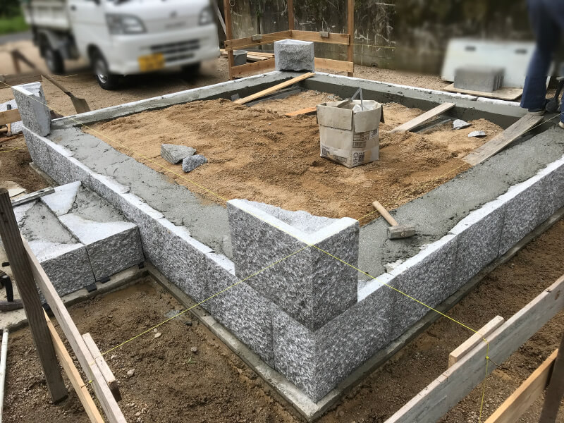 基礎が完成したら、そこへ間知石(けんちいし)の石積みをします。今回は、高さのあるお墓にしたいというご希望で、お城の石垣のような間知石積みのお墓にすることになりました。御影石製の間知石で、このような先のとがった形をしています。これを一段目から順に積んでいきます。