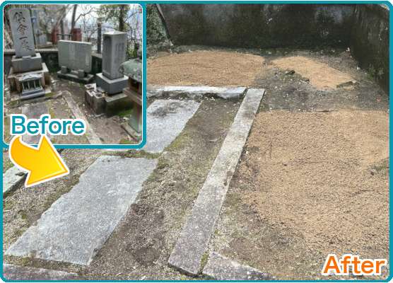 遠方にお住まいのお客様からご依頼いただいたお墓じまい工事です。機械が入れない傾斜地でしたので、人力のみで工事を実施。石段を保護するため運搬車の道を作り、慎重に解体・搬出しました。無事お墓じまいが完了し、「安心しました」とホッとされたご様子でした。